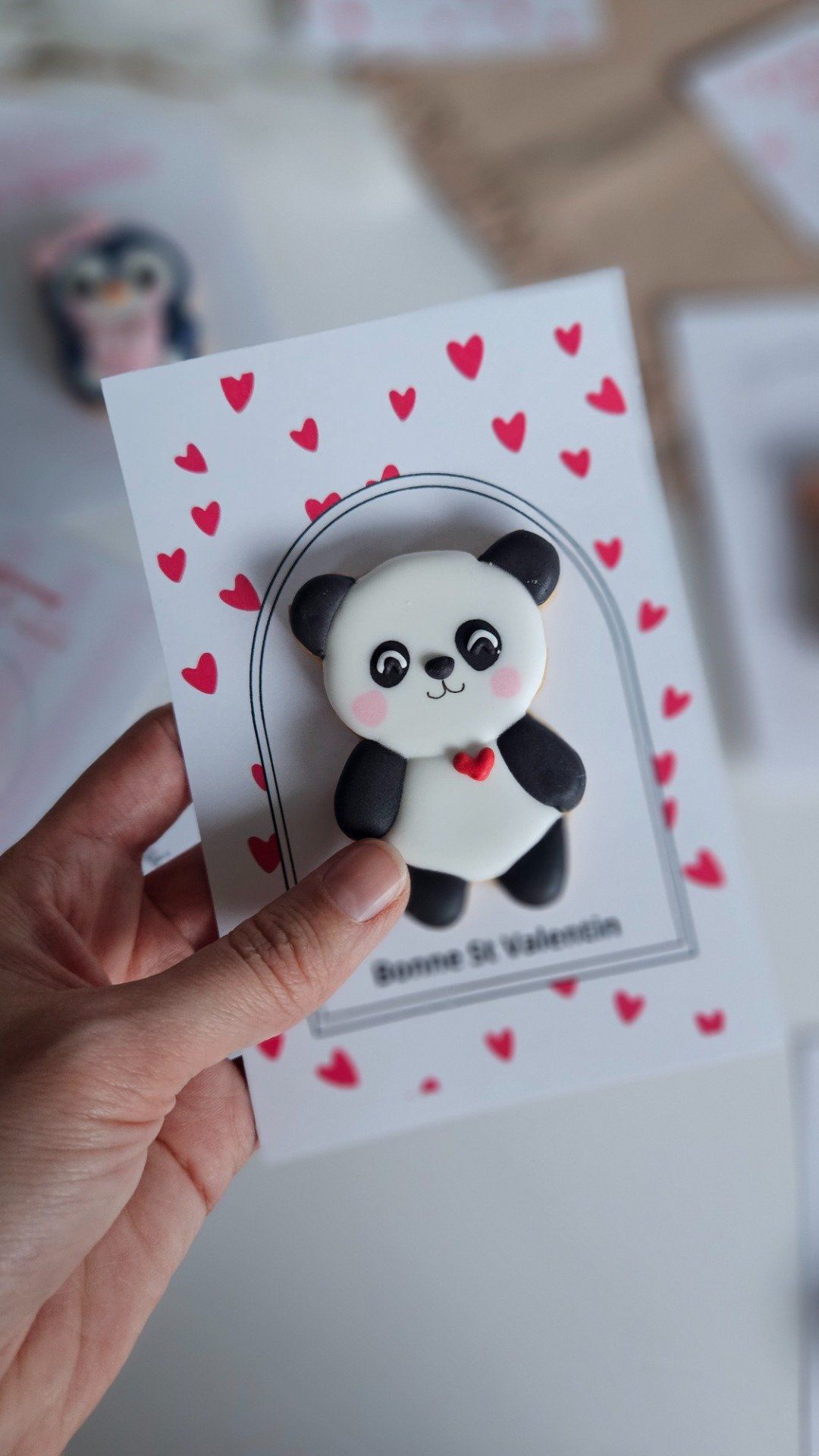 Biscuit décoré au glaçage royal représentant un panda avec un petit cœur, présenté sur une jolie carte.