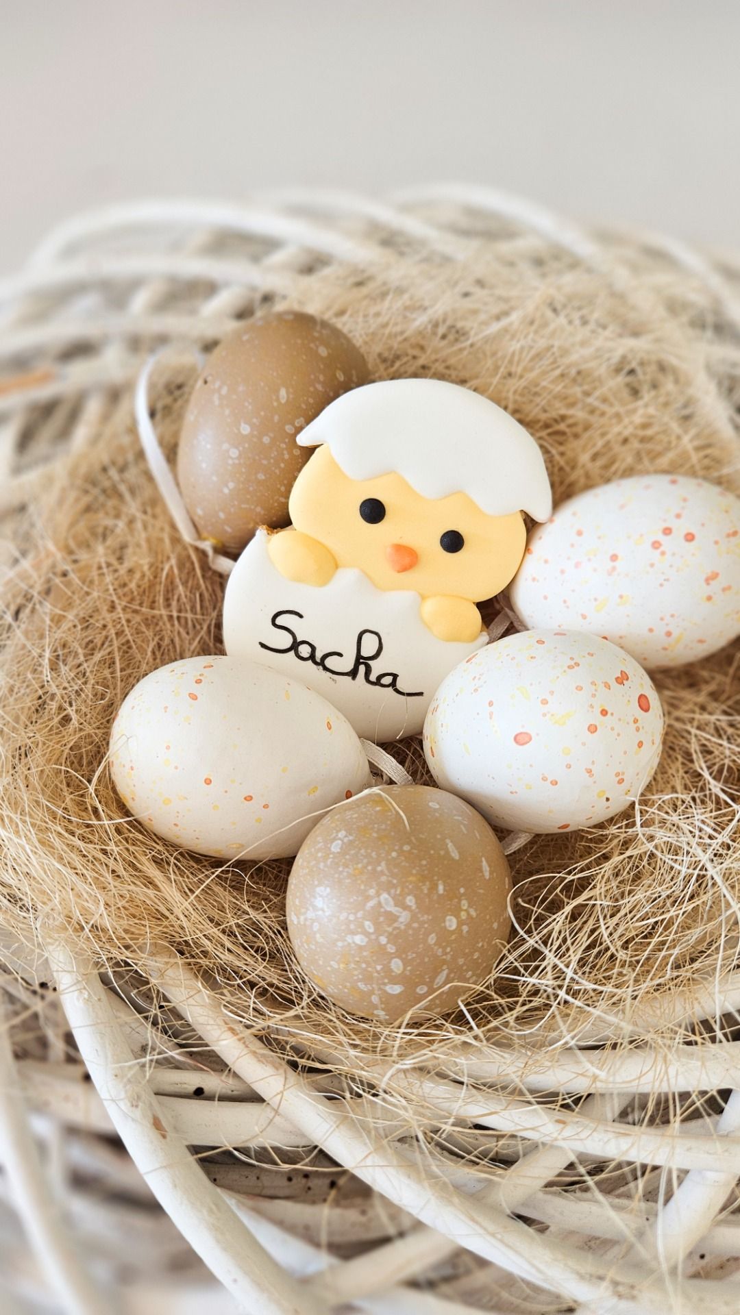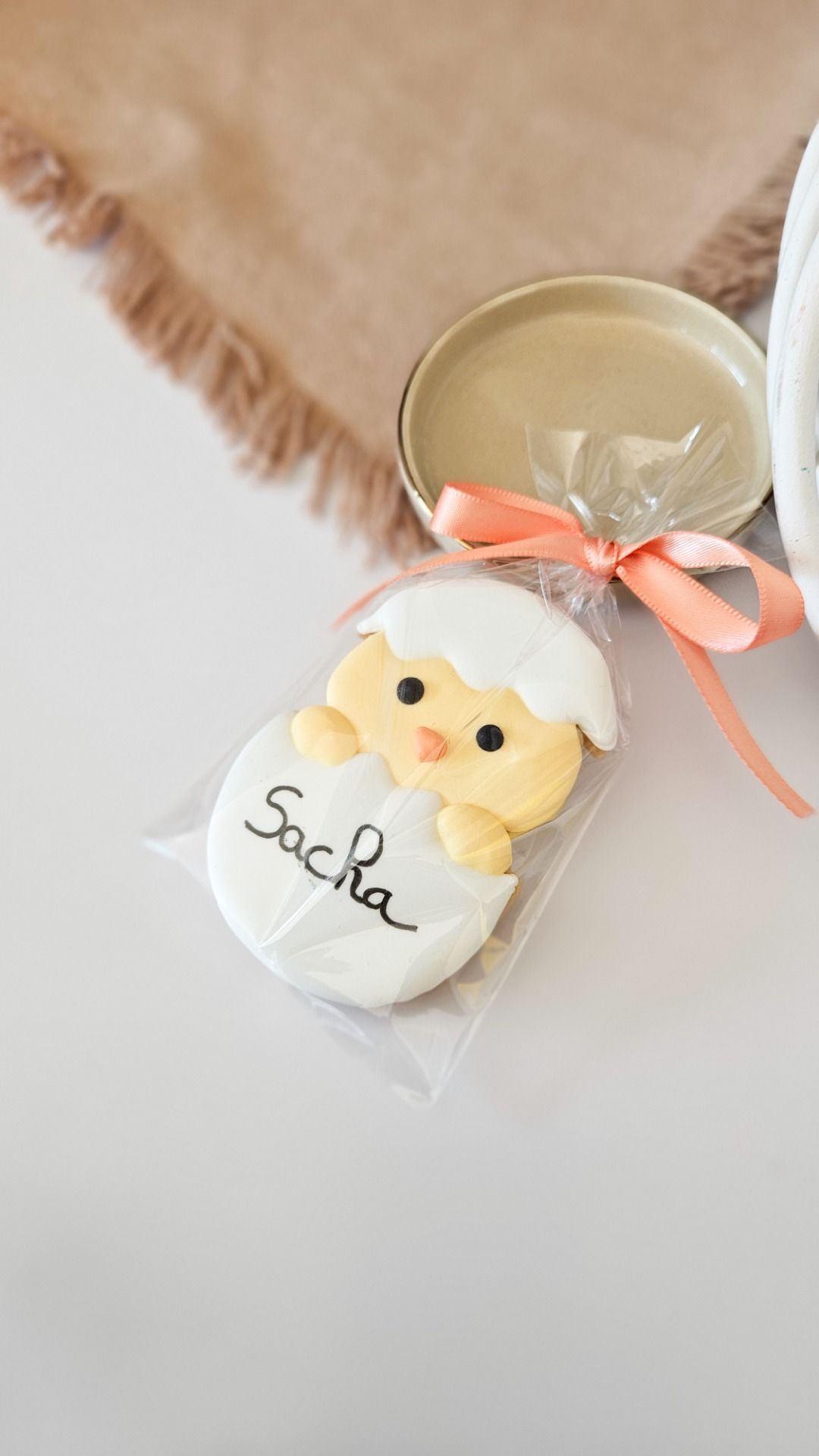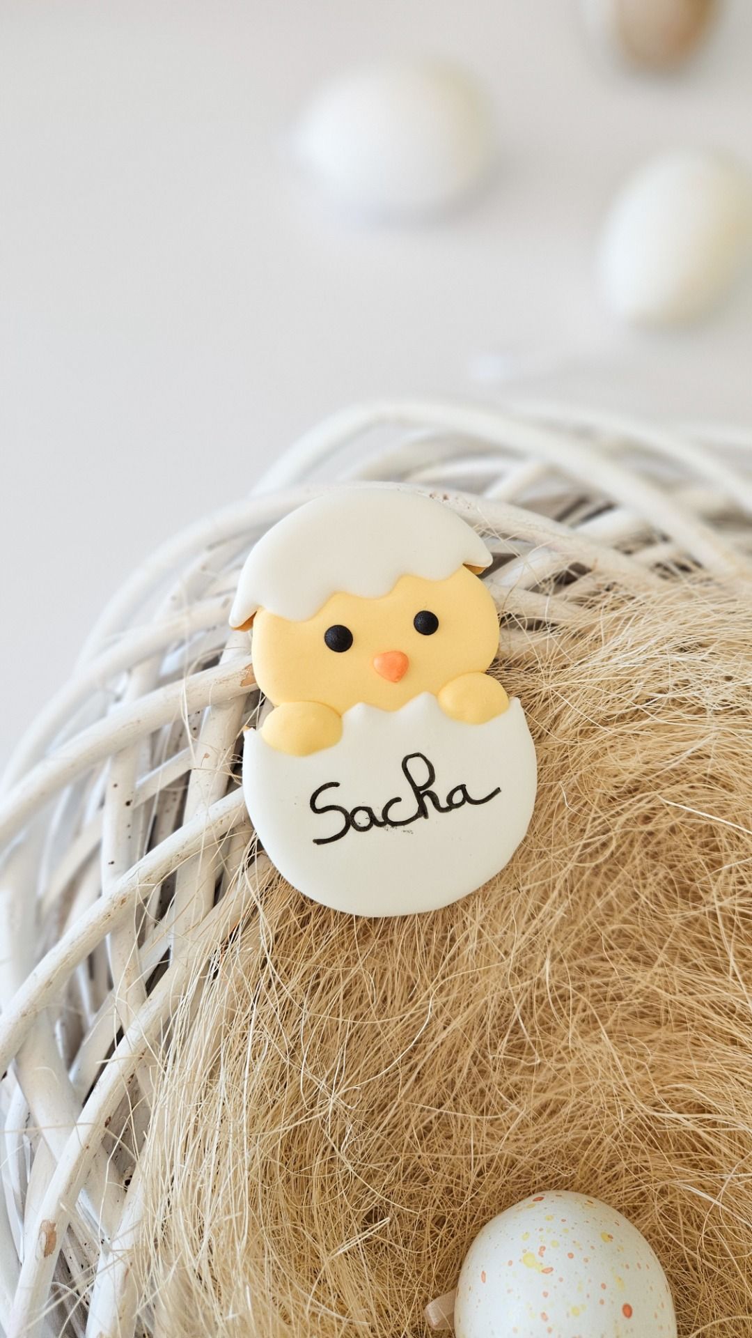 Biscuit décoré au glaçage royal, en forme de poussin dans sa coquille personnalisable en mettant un prénom