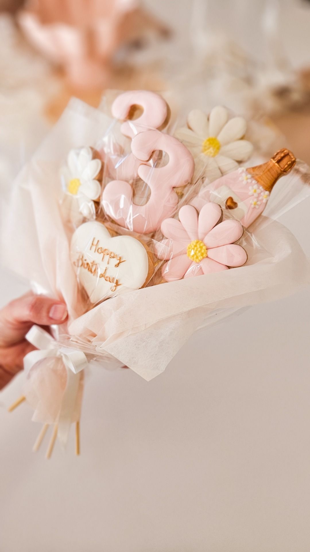 Bouquet gourmand de biscuits décorés à la main, composé de sablés fleuris, de chiffre personnalisé et d’un message « Happy Birthday ». Un cadeau original et élégant pour un anniversaire.