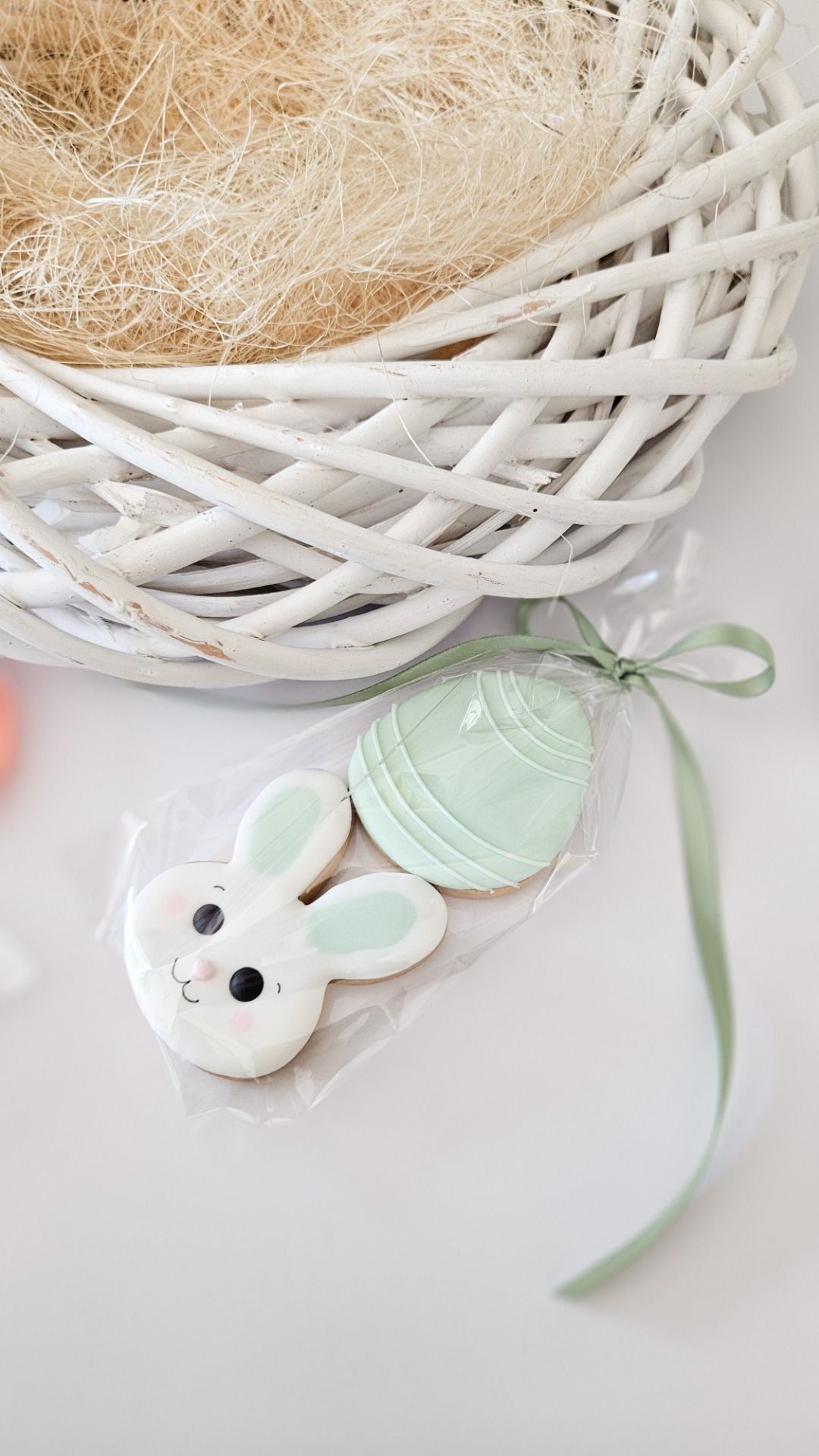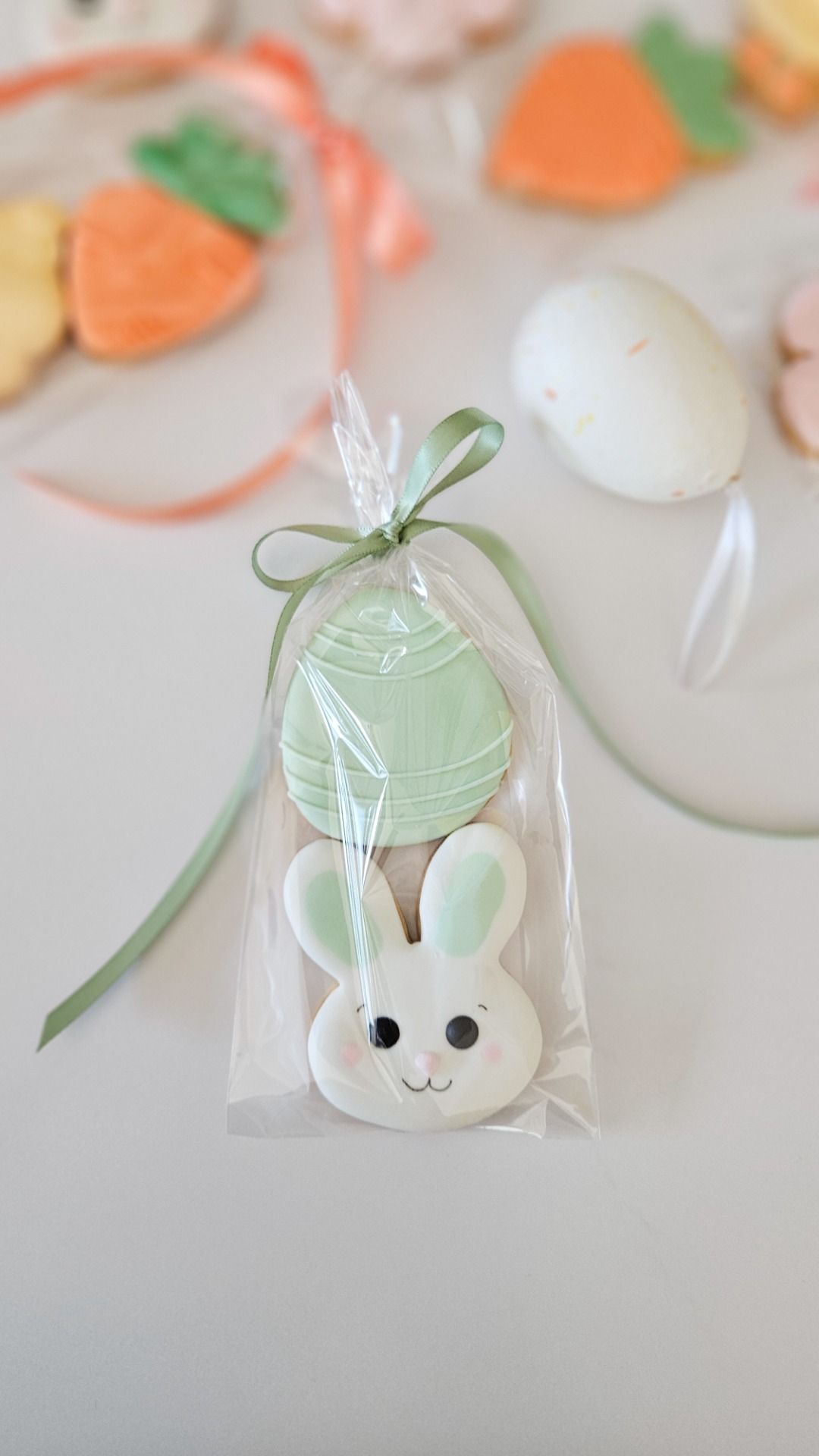 Trio de biscuits décorés au glaçage royal, en forme d'oeuf et de lapin sauge.